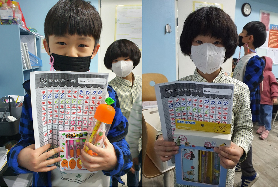 Phonics beginner B-3 John (한준영) & Tom (김진호) both completed the stamp reward sheet and received presents for doing all the homework, classwork, and participation. Congratulations and keep up the good work!