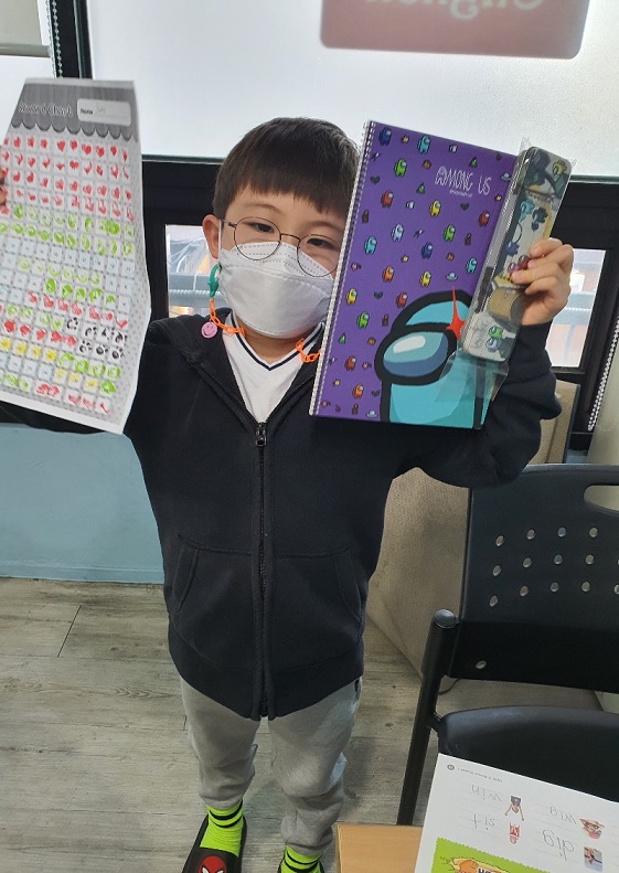 Phonics Beginner class - June (서준) finished stamp collection and received a prize. He did all his homework, participated in class, and did an excellent job on his classwork. Congratulations and keep up the good work!
