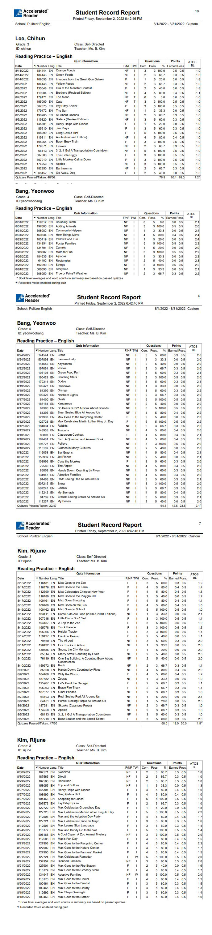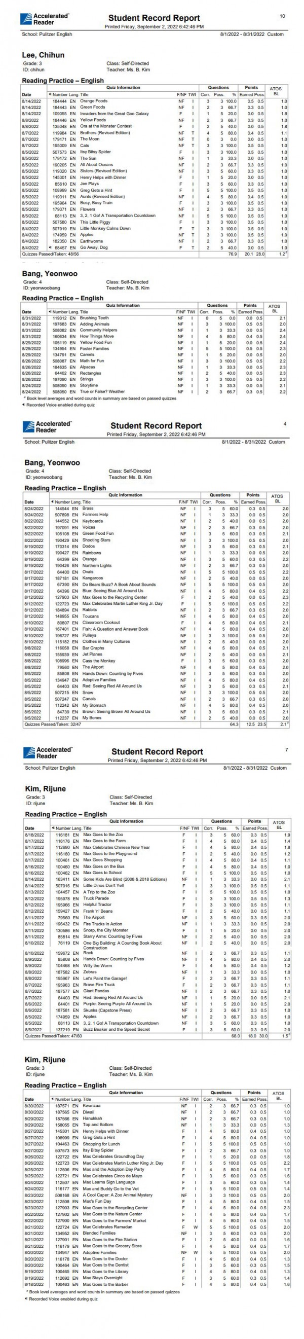 8월 한달간 열심히 독서를 하고 퀴즈를 풀어 목표점수를 획득한 아래 학생들 칭찬합니다.