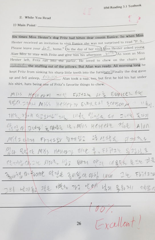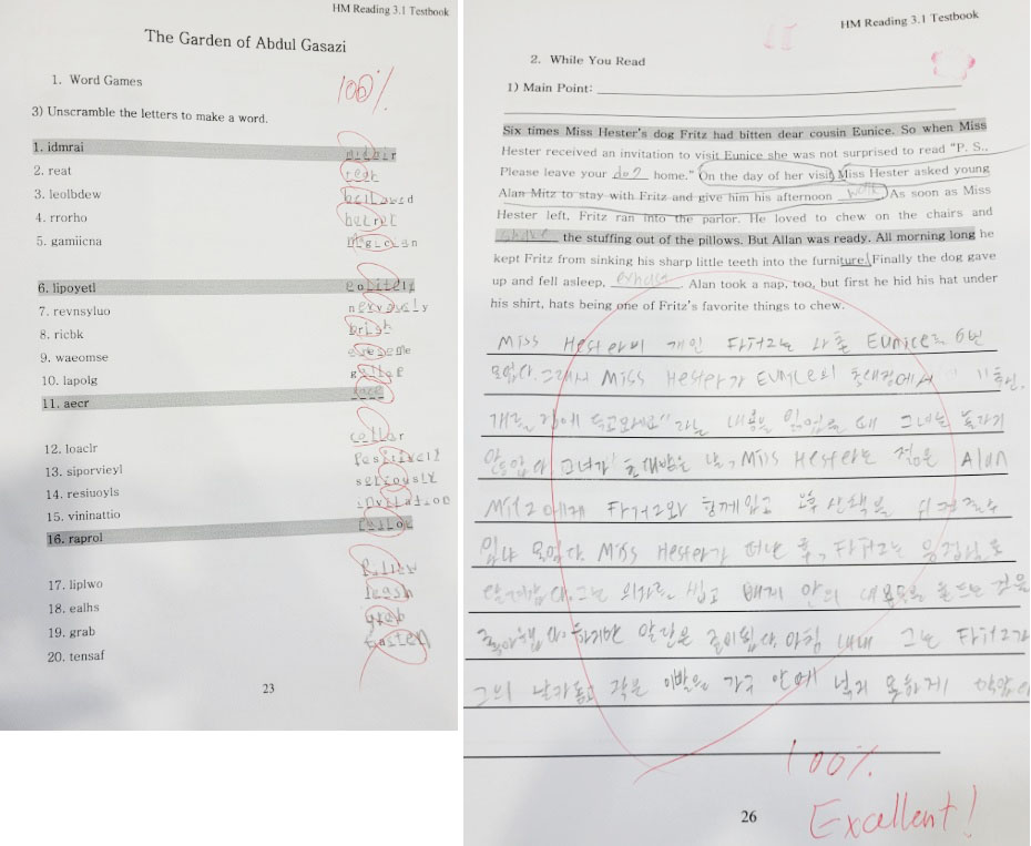 E3.1A - 정유은 (Yueun) got a perfect score on the synonym & antonym test, 홍서준(Evan) got a perfect score on the unscramble test, and 홍연준 (Peyton) got a perfect score on the first translation exam for the story, "The Garden of Abdul Gasazi". Keep up the good work everyone!