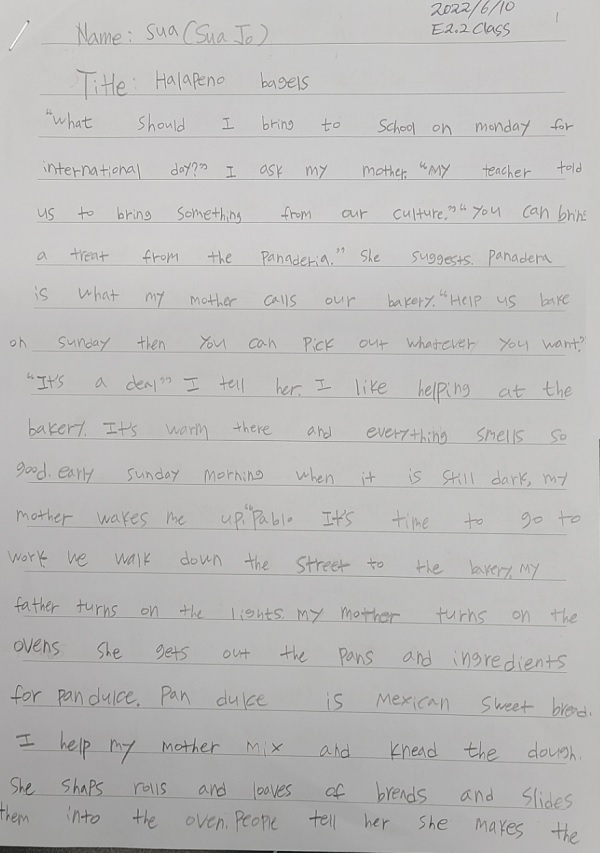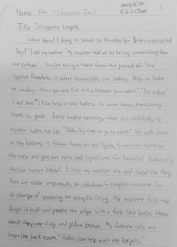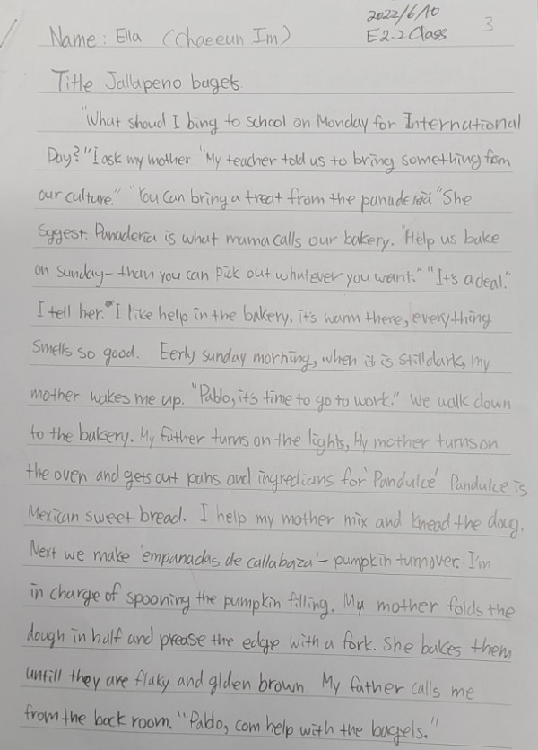 E2.2B 임채은, 조수아 학생이 Halapeno Bagels를 읽고 글을 잘 썼습니다. 칭찬해 주세요.