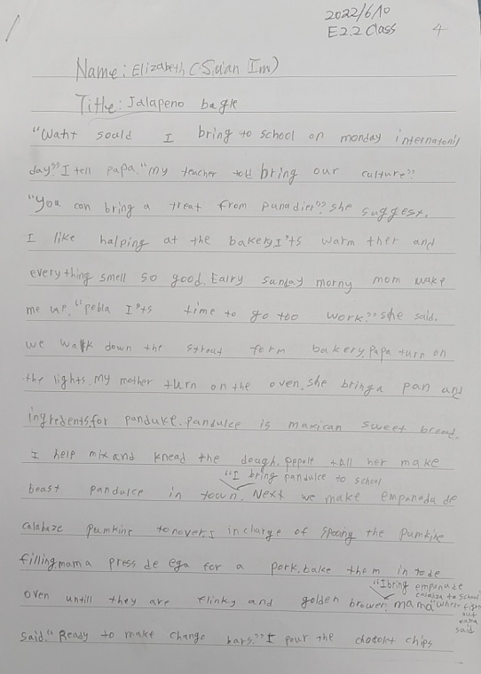 E2.2B 인수안 학생이 Halapeno Bagels를 읽고 글을 잘 썼습니다. 칭찬해 주세요.