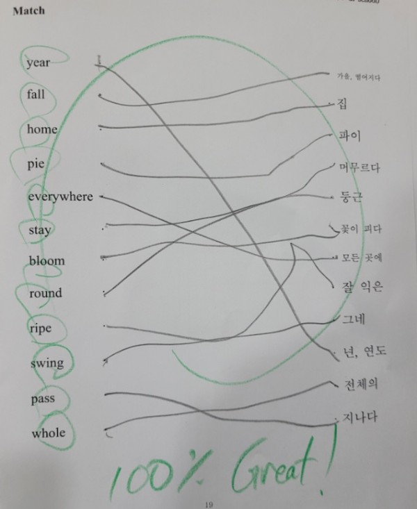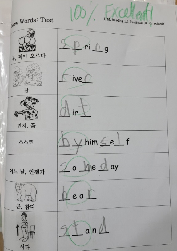 1.4B - 이치헌 (Ben) got perfect scores on all tests for story, "Johnny Appleseed". I'm very proud of him. He has been doing all his homework and trying to speak English during class. Overall he has shown a lot of improvement and putting in the effort to learn English. Superb!