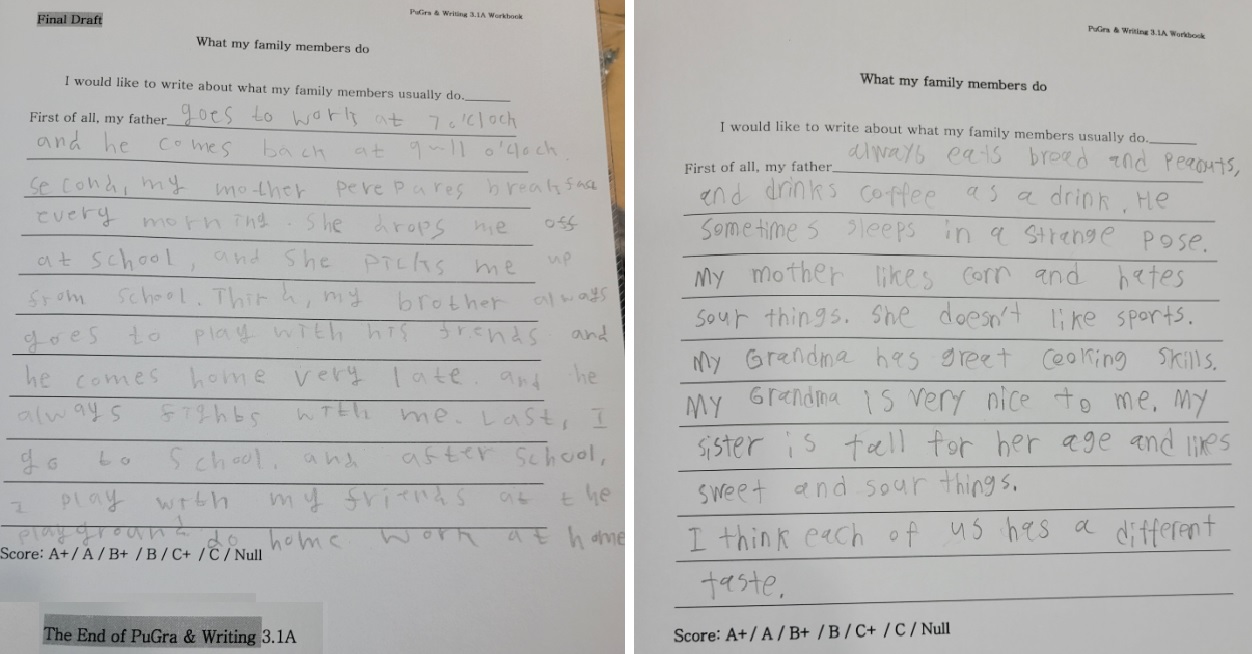 E3.1B - 이래의 (Raina) and 박준서 (Junseo) did an excellent job on their writing assignment for Pugra 3.1A first drafts. They rewrote their final drafts after proofreading and corrections by the teacher. Overall they showed in their writing how to use the grammar points we learned in the unit about affirmative and negative sentences. Amazing work!