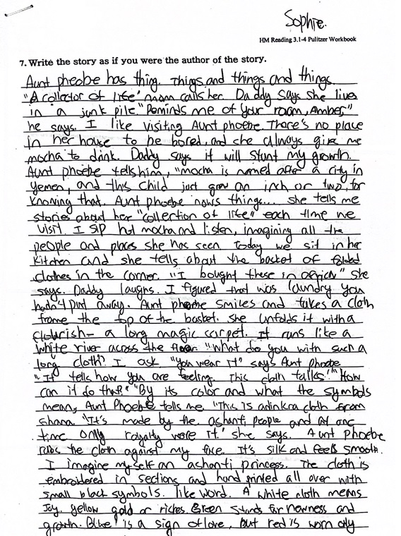 Comment: Sophie’s story writing about Talking cloth shows her effort and interest in the story. She used the learned words and expressions freely and thoroughly to express the story line. Excellent job, Sophie