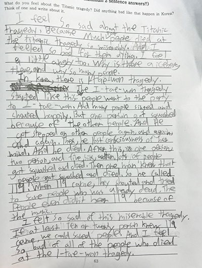 Today, we did an activity where we wrote about our feelings regarding the Titanic tragedy and any tragedies that have occurred in Korea. Han did an excellent job writing about the Itaewon Halloween tragedy, using the six Ws (육하원칙) and expressing his sorrow about the incident.