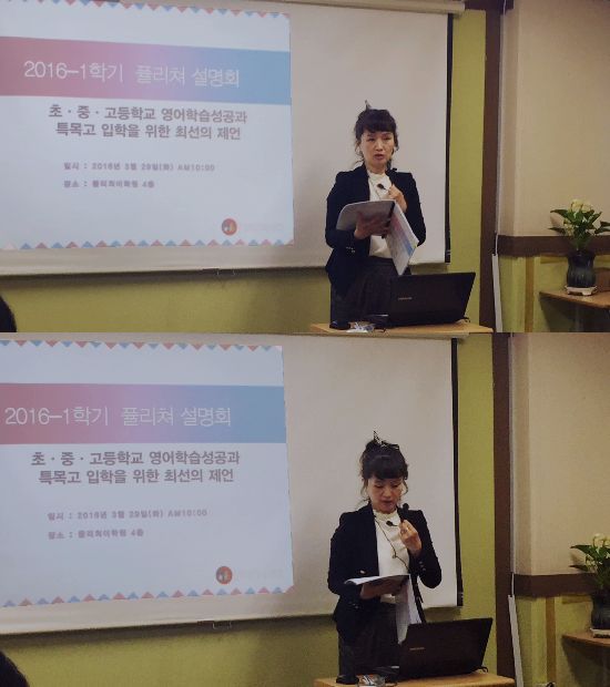 2시간 가량 진행된 이번 설명회는 '초중고등학교 영어학습성공과 특목고 입학을 위한 최선의 제언'을 주제로 하였으며,