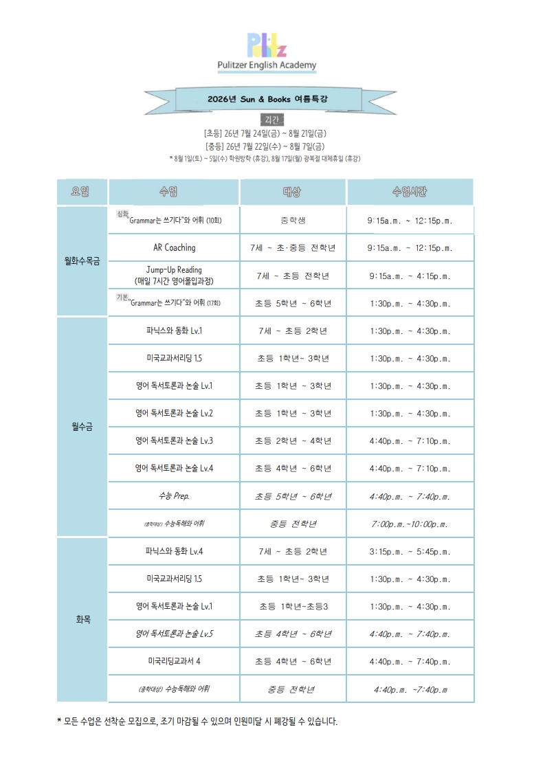 2026년 여름특강 시간표