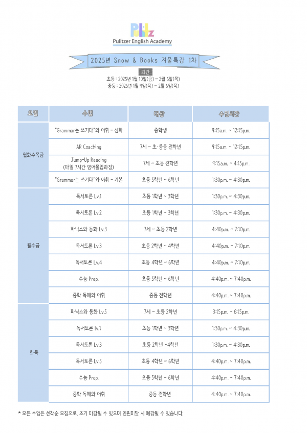 2025년 겨울특강 시간표