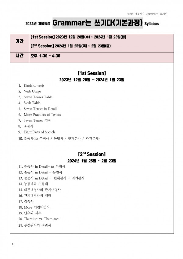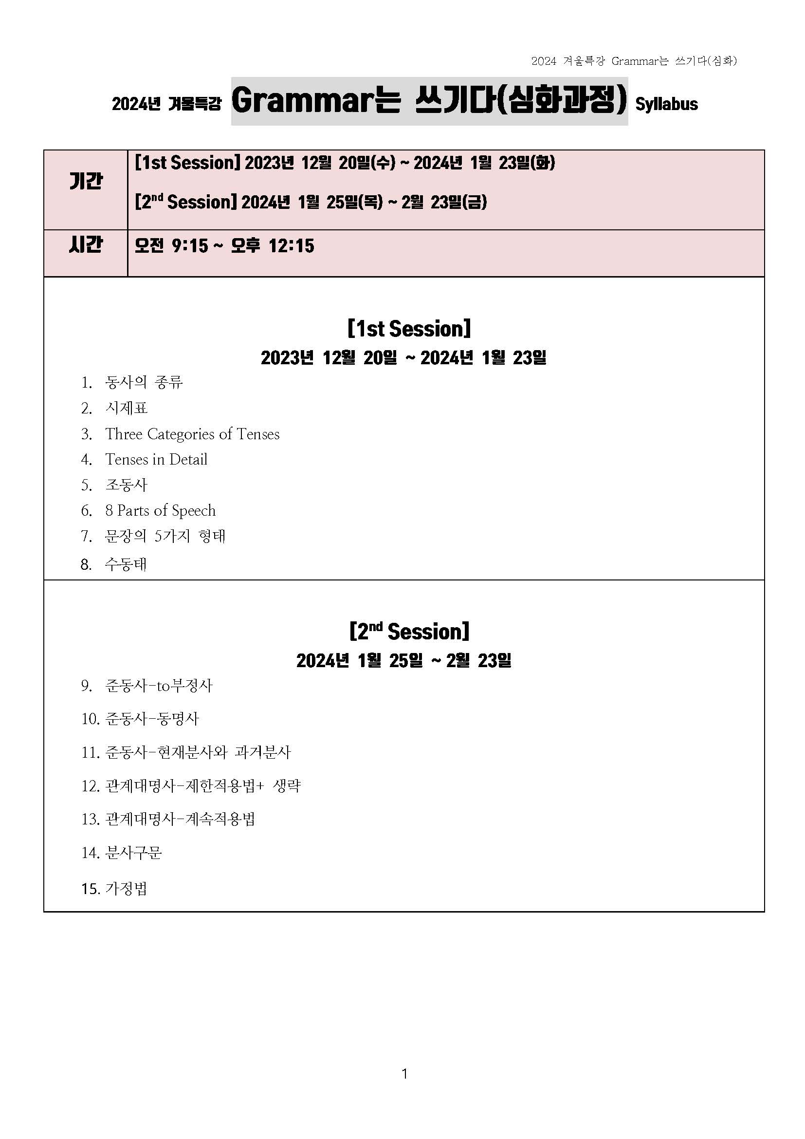 2024년 겨울특강 'Grammar는 쓰기다' Syllabus