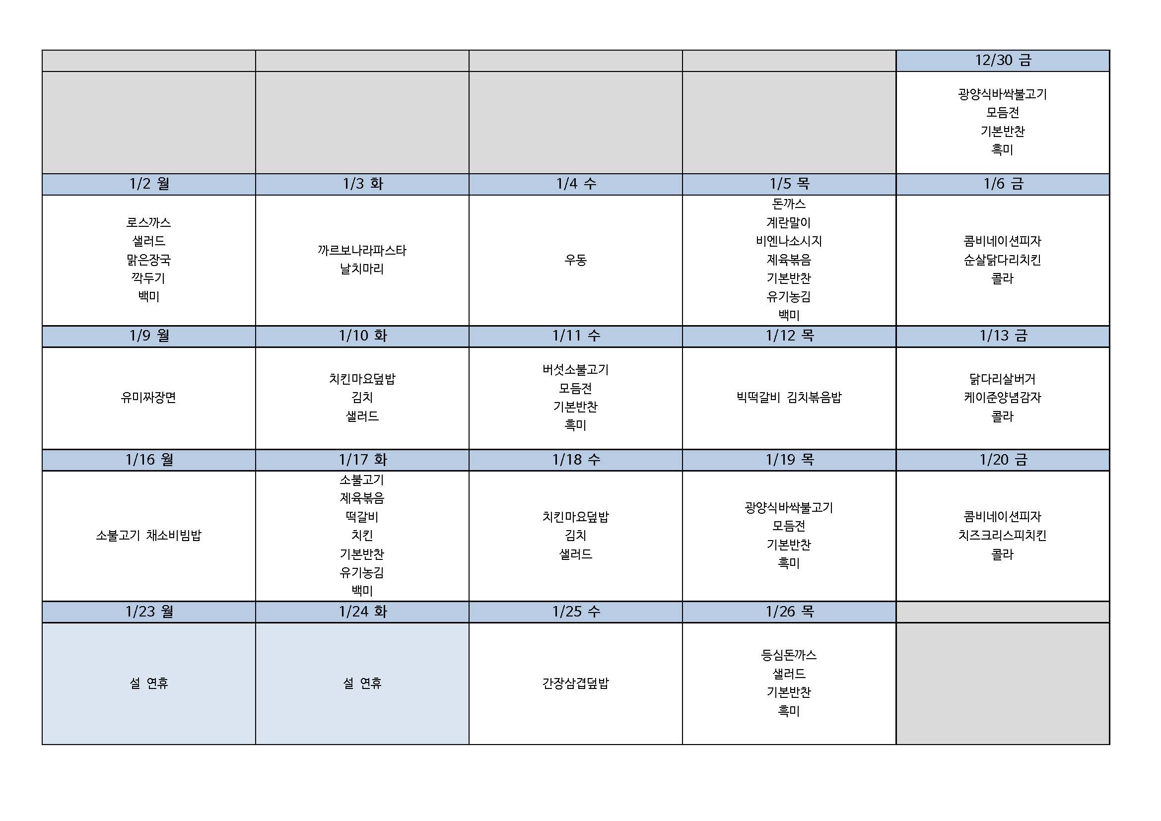22.12.30~23.1.26에 진행되는 2023년 겨울특강 점심 식단표입니다.