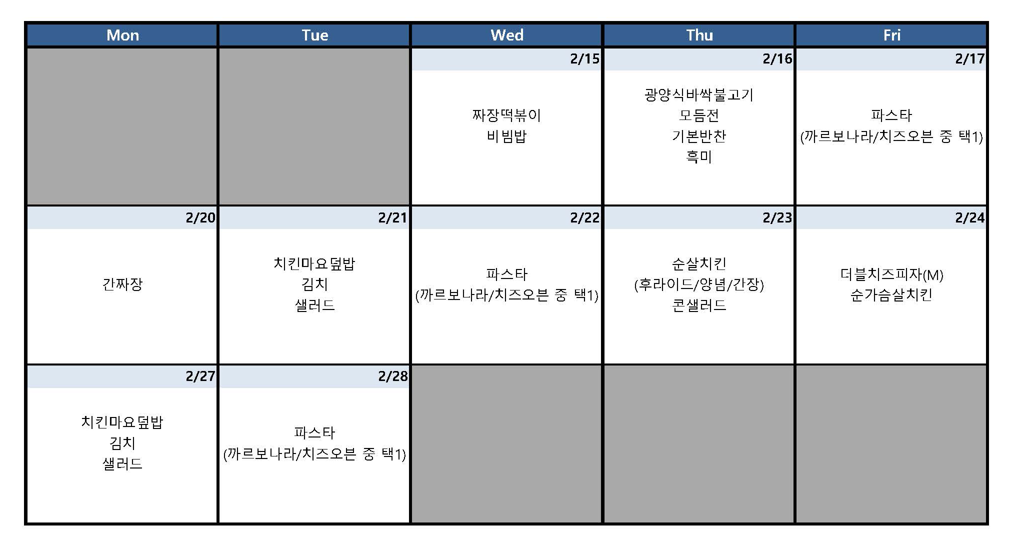 23년 2월 14일부터 28일까지의 Jump-Up 특강 점심메뉴입니다.