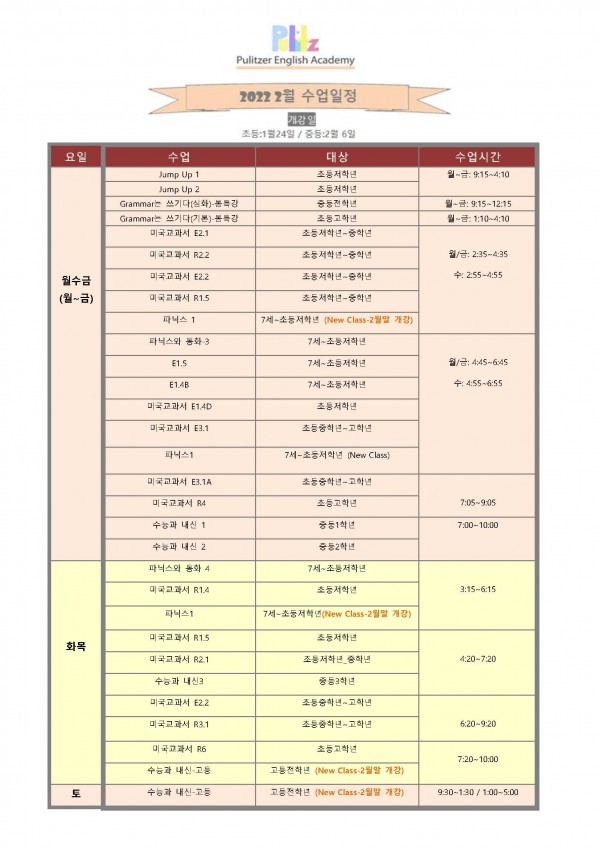 2022 2월(2022.1.24~2.23) 수업 일정 안내
