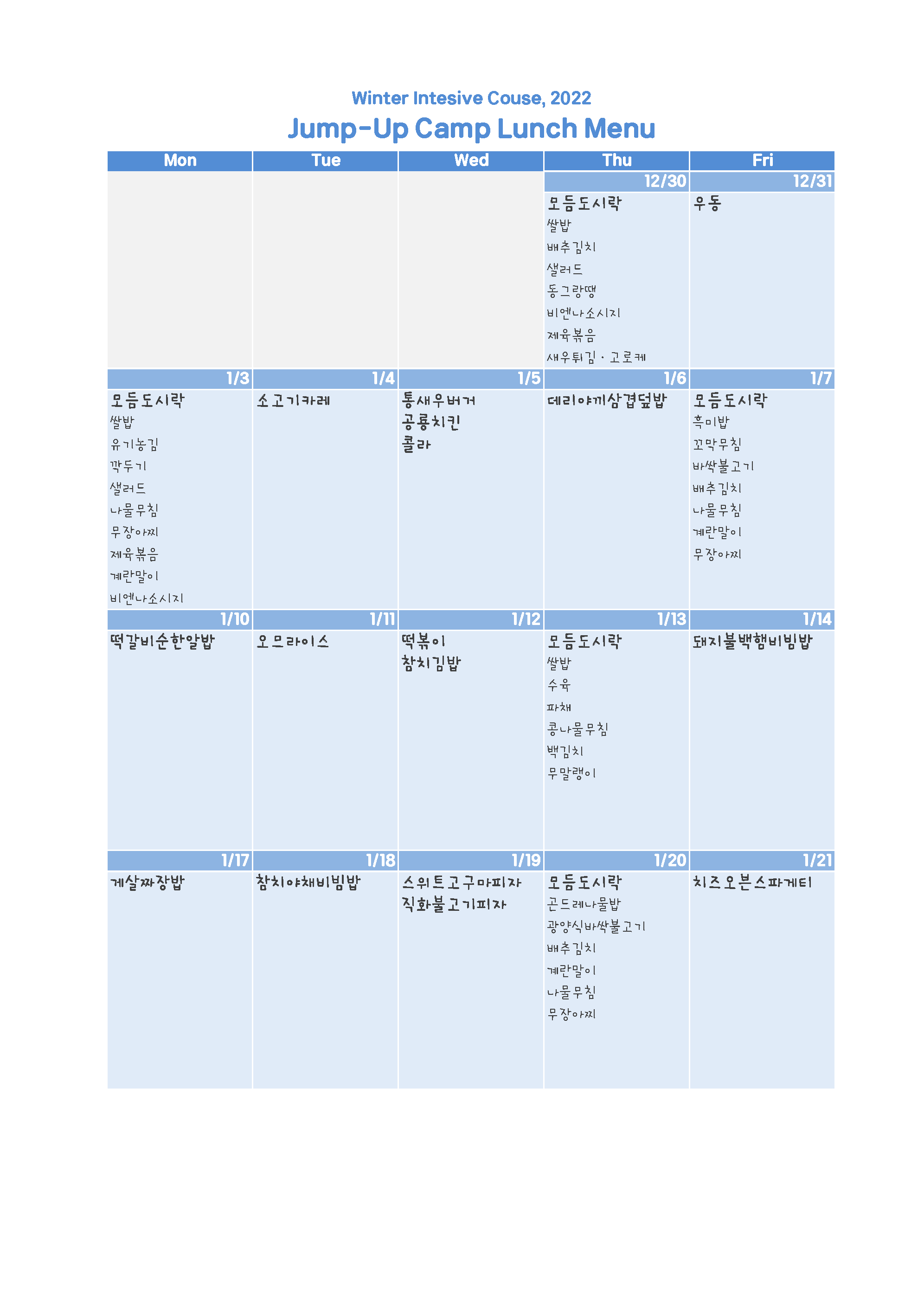 2022년 겨울특강 Jump-Up Syllabus & Lunch Menu 안내