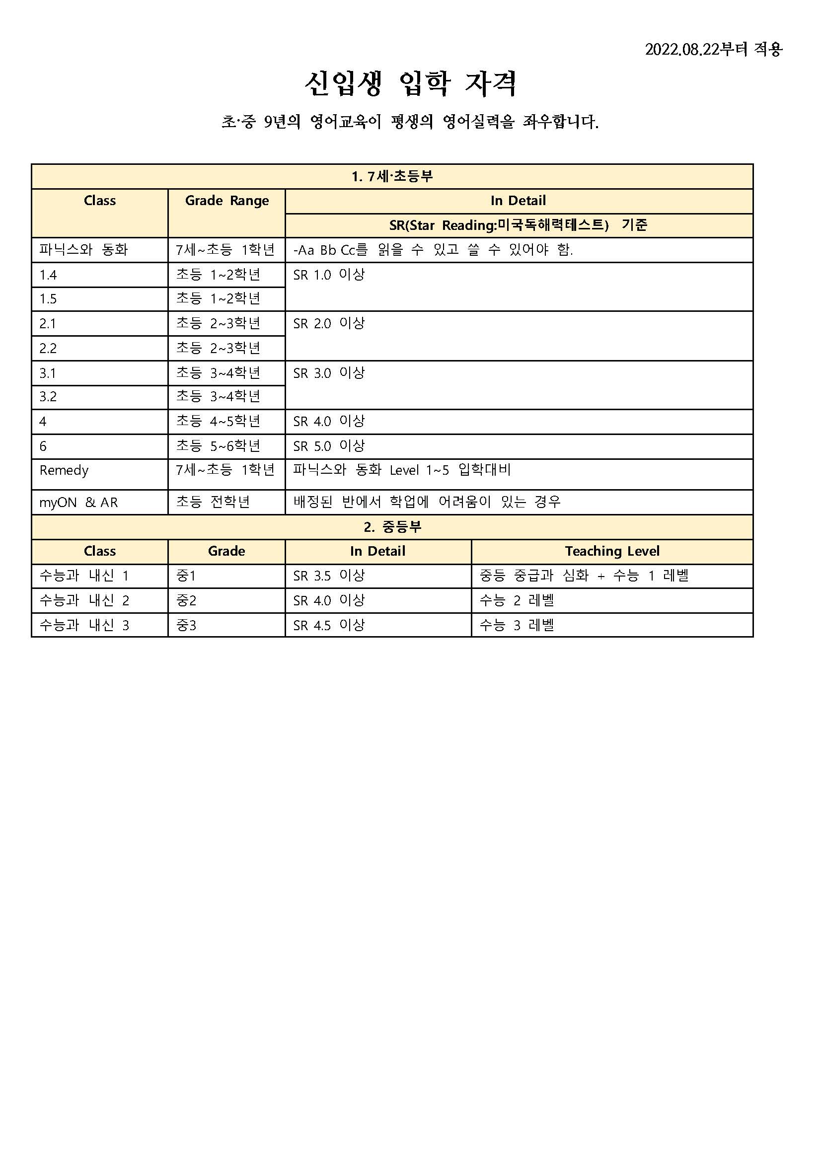 퓰리처영어학원 신입생 입학 자격(22.8.22부터 적용)