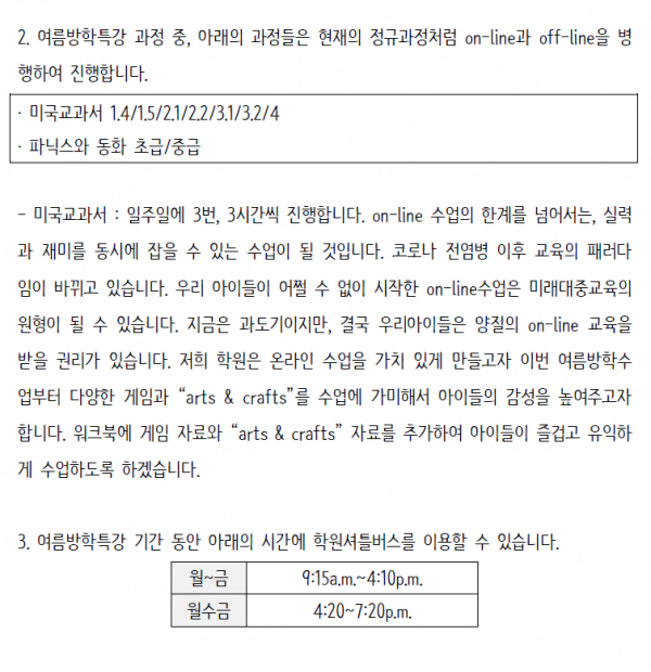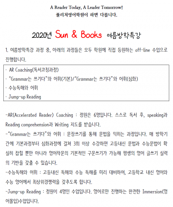 2020년 Sun&Books 여름방학특강 각 과정 특징