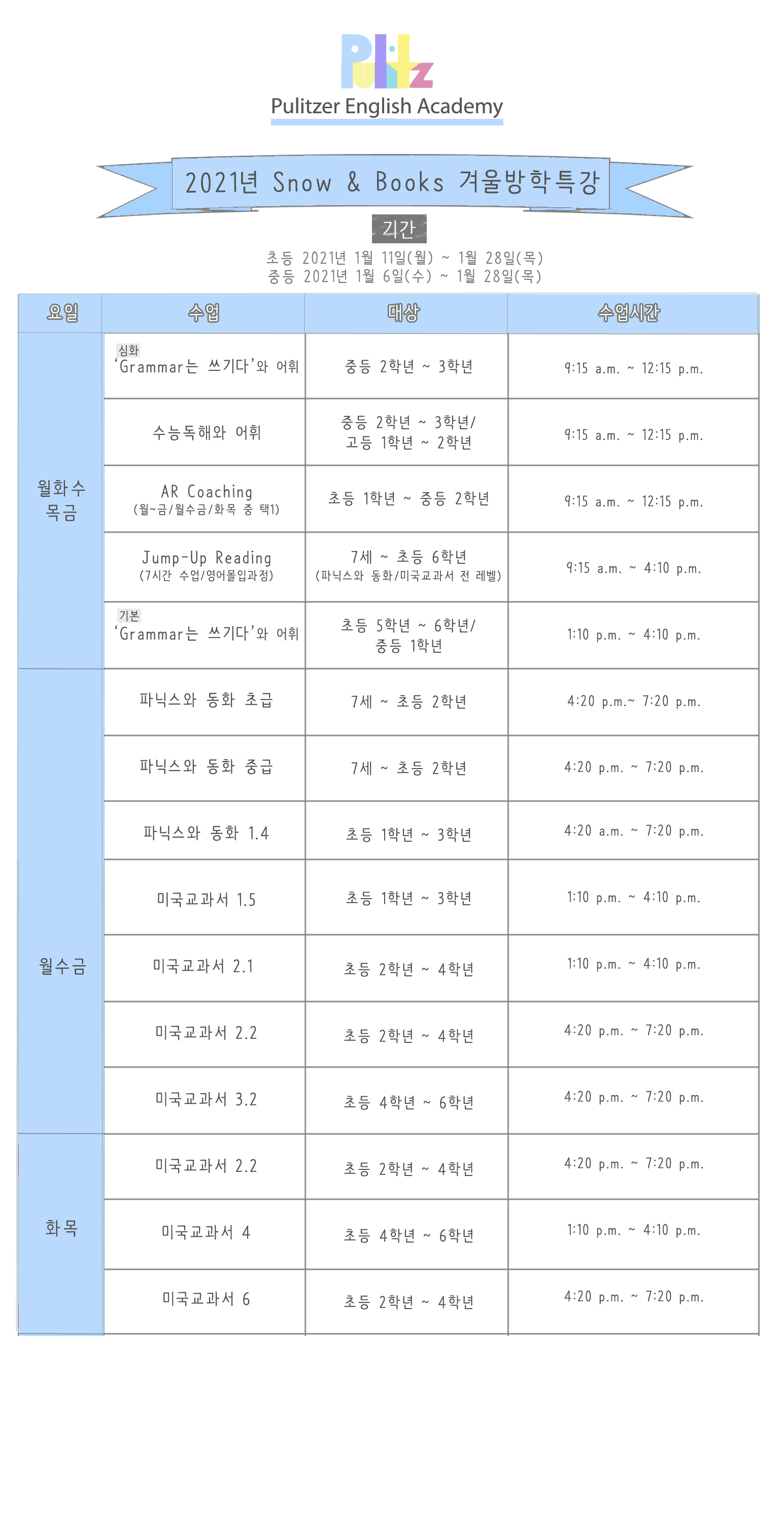 2021년 SNOW&BOOKS 겨울특강 시간표