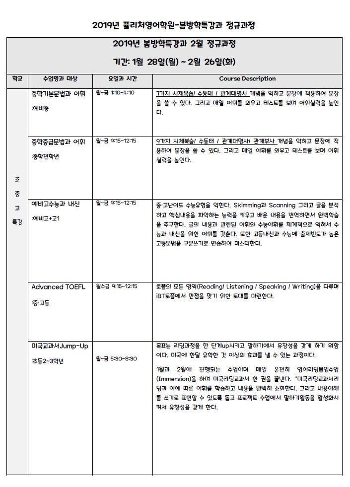 에 진행되는 봄 방학 특강 프로그램입니다.
