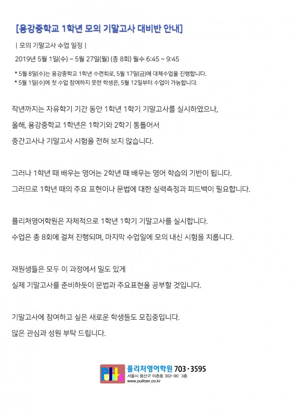 용강중학교 1학년 모의 기말고사 대비반 안내