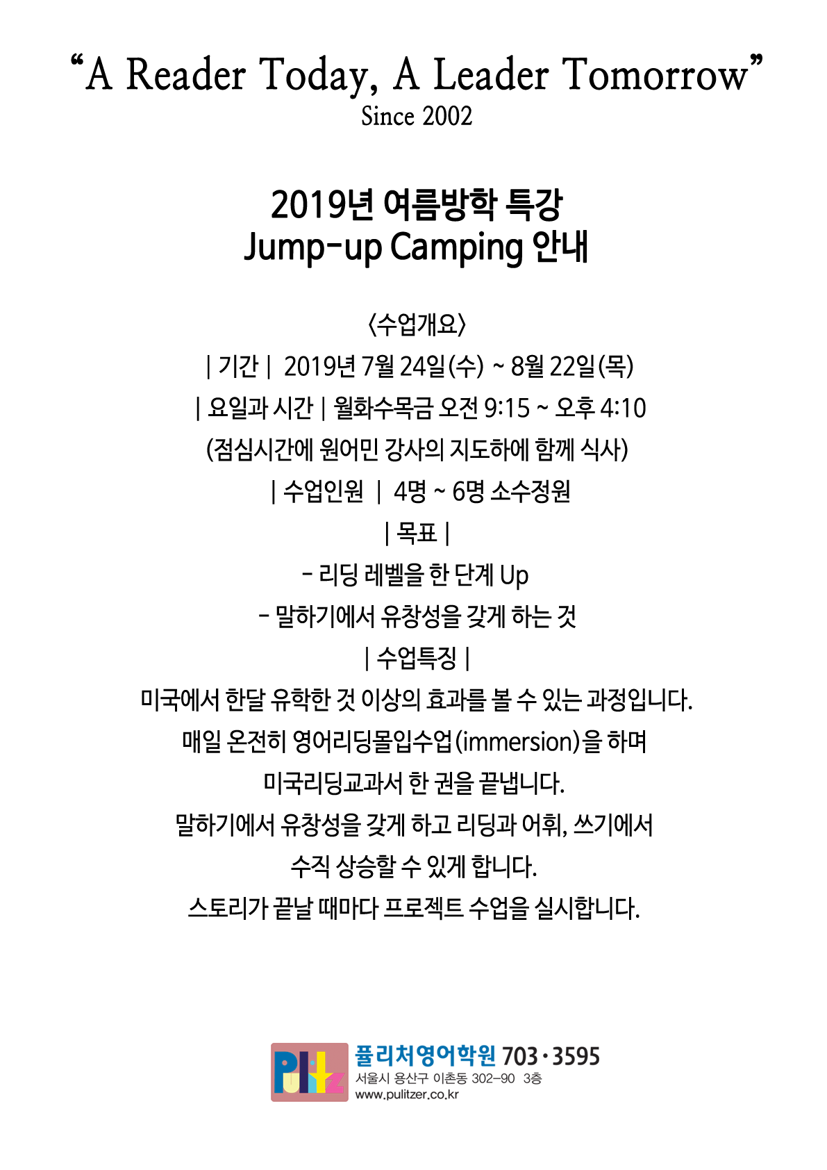 2019년 여름방학 특강 Jump-Up Camping 안내
