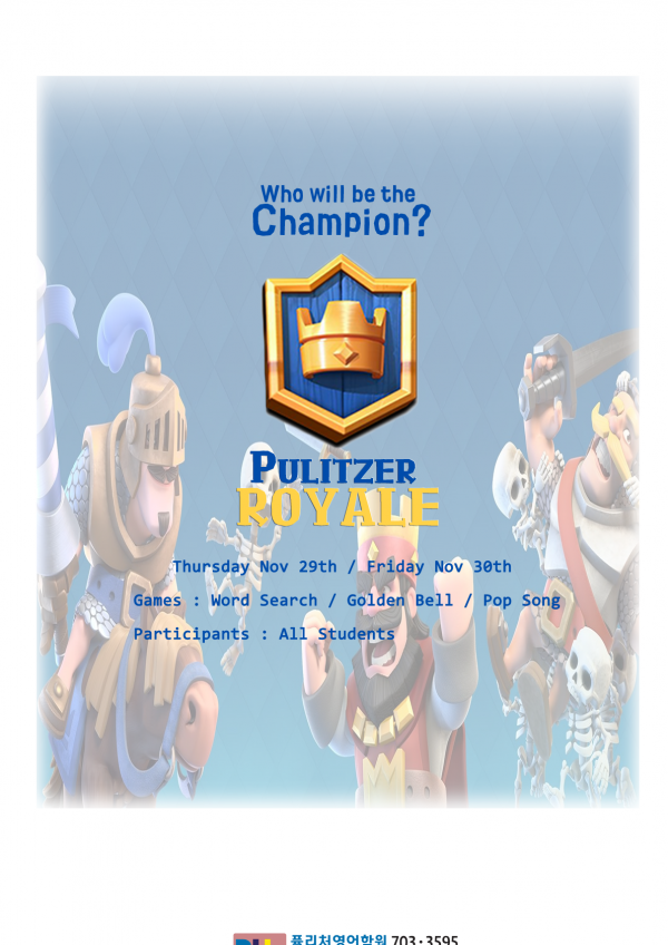매달마다 Pulitzer Royale(Pulitzer English Academy Monthly Contest)를 개최합니다.
