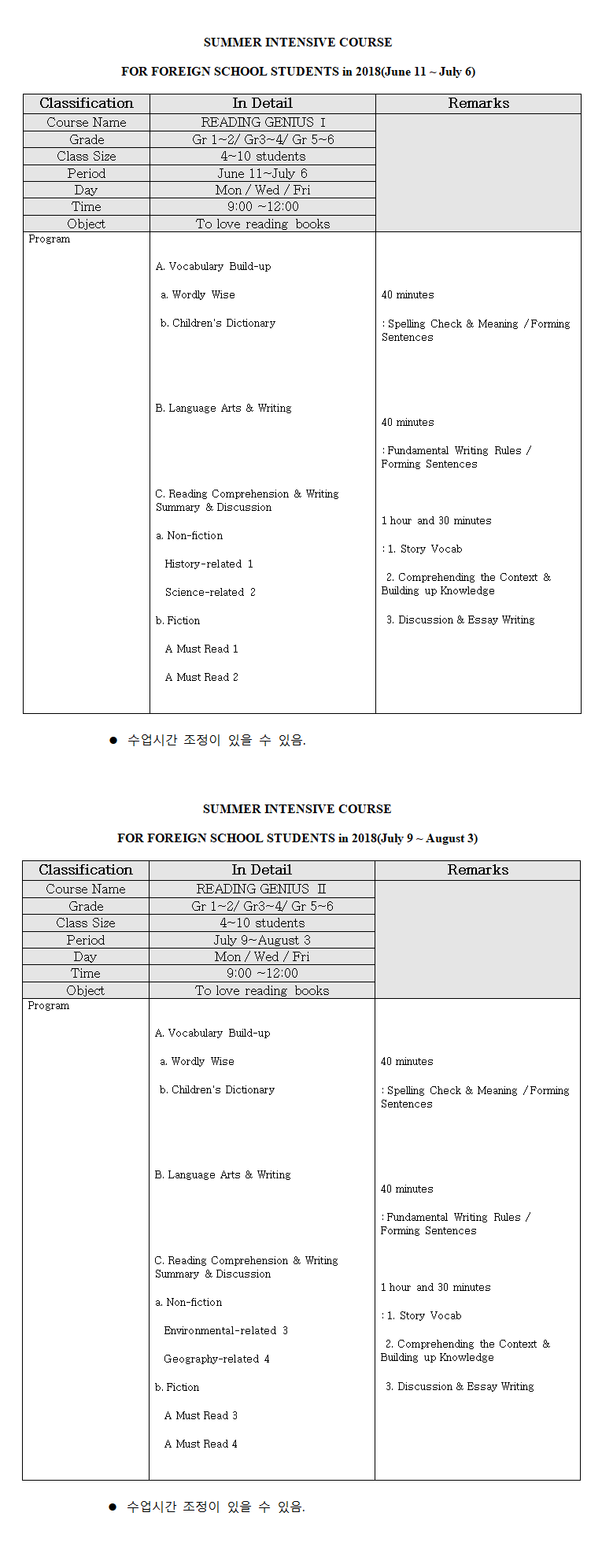 국제학교 학생들을 위한 2018년 Summer Intensive Course가 6월 11일부터 7월 6일까지 오픈합니다.