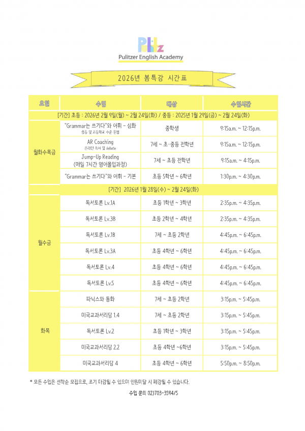 * 수업문의)02-703-3594/5 퓰리처영어학원