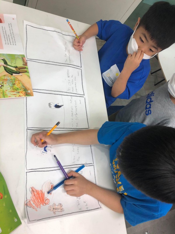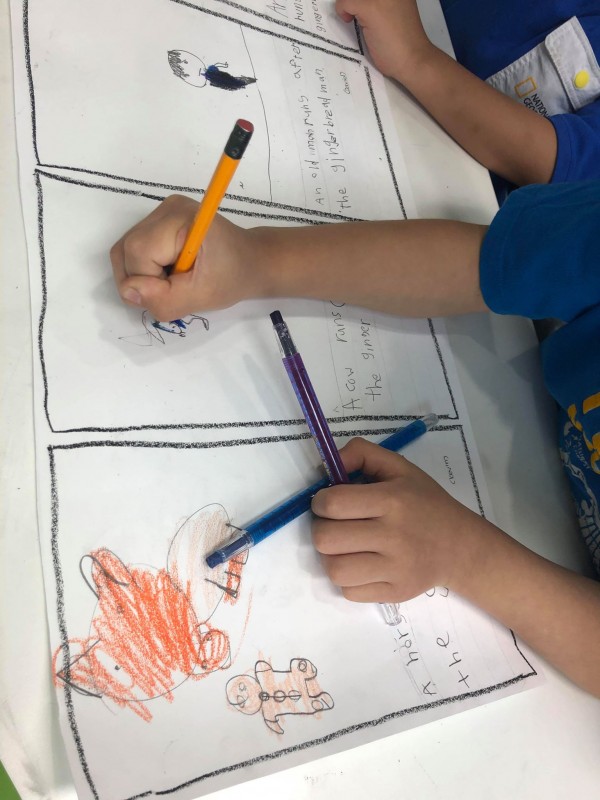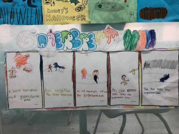 The students made a mini comic strip related to "The Gingerbread Man". They did the writing, drew pictures, and colored all by themselves.