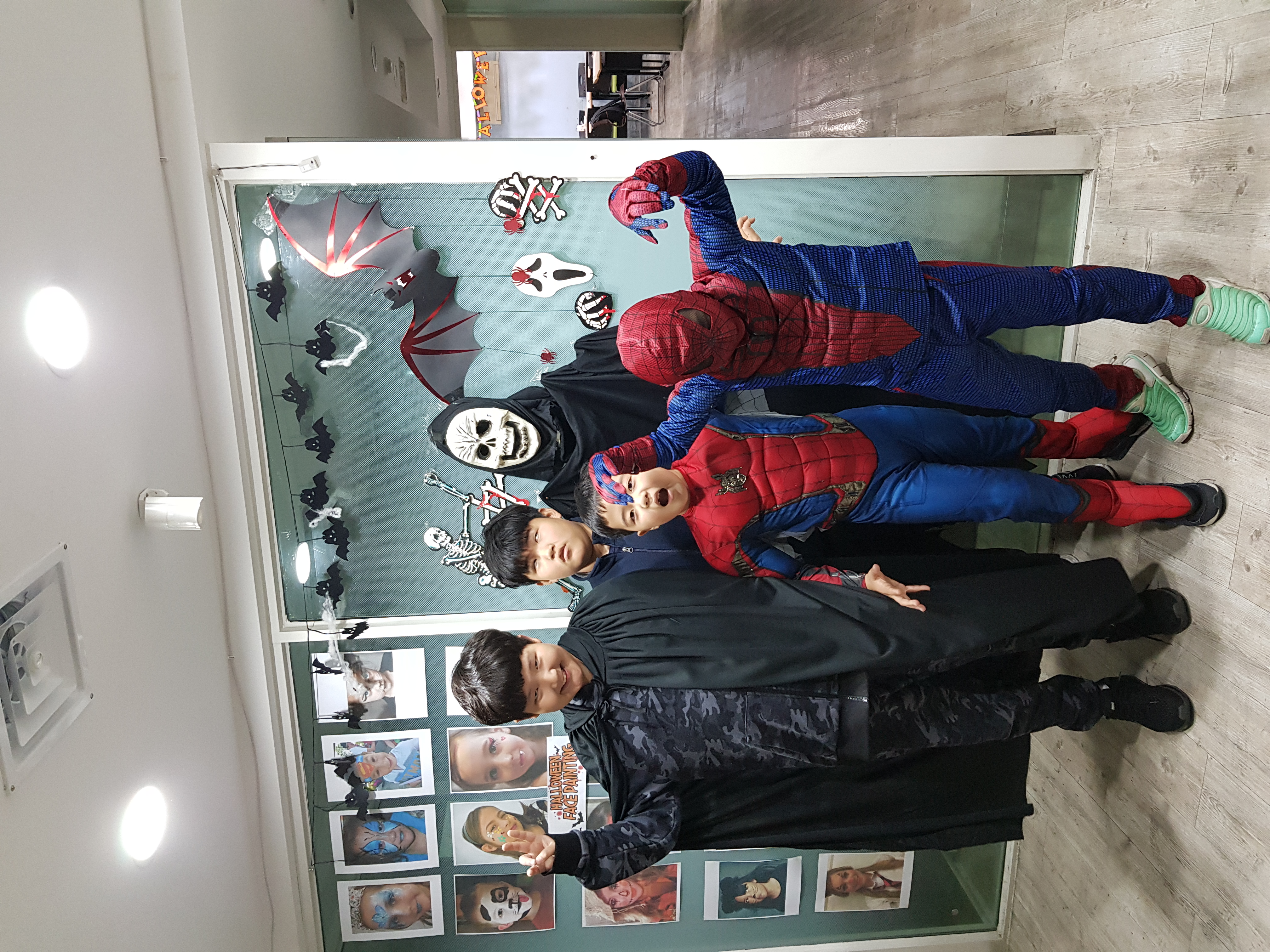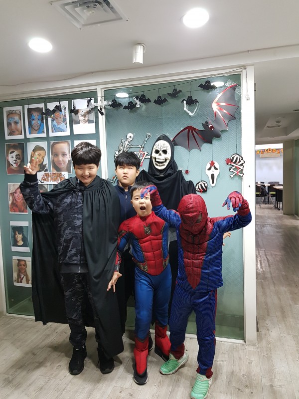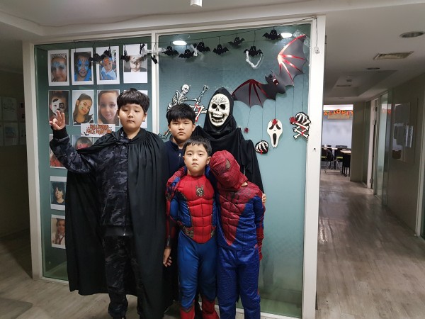 Reading 2.2 Returnee class From left to right: 이두현(Aaron), 염위은(Weien), 정아준(Ahjun), 문재원(Jaden) Top picture: Rawrrrr! We are zombies?! Bottom picture: Happy Halloween!