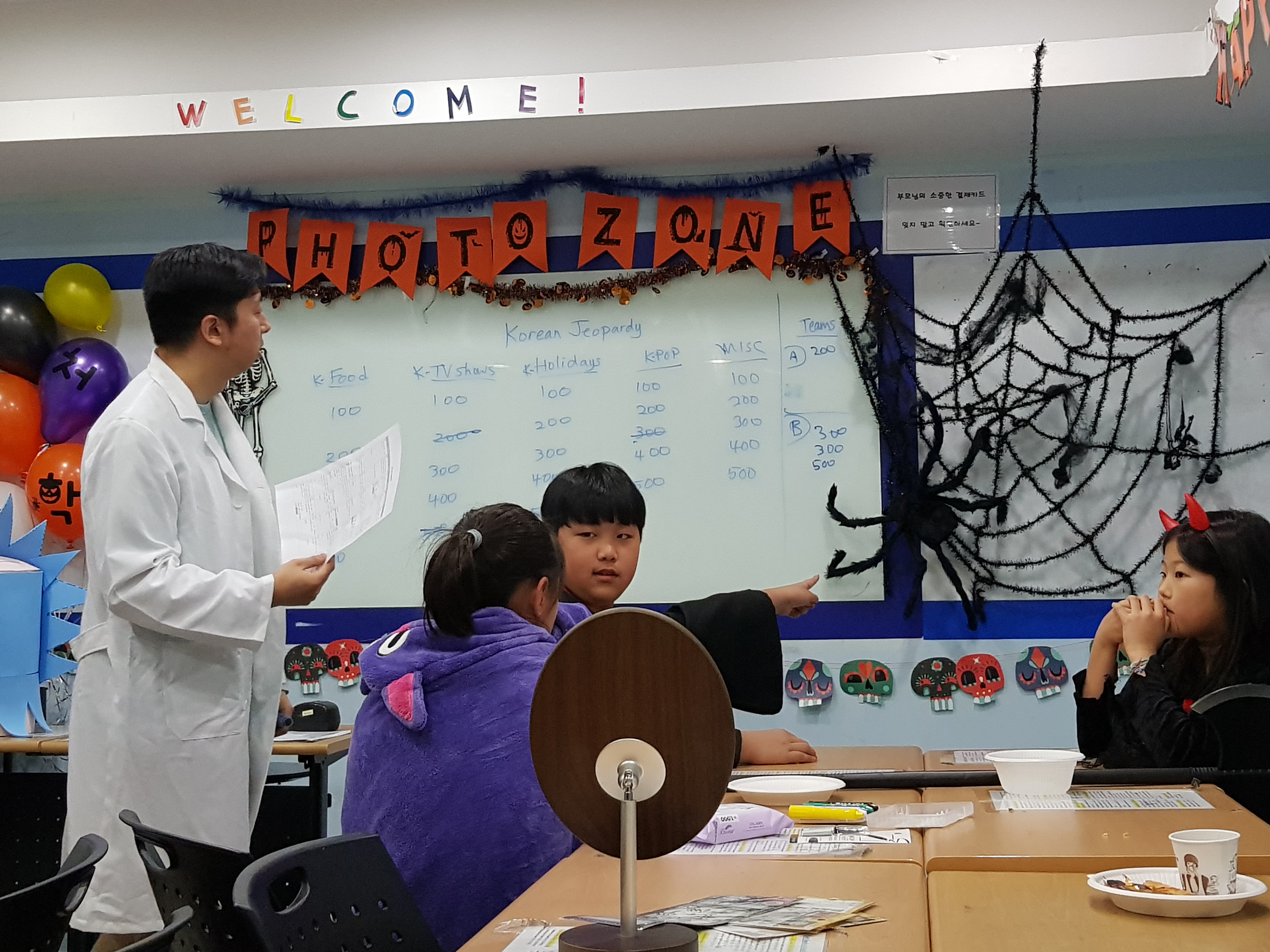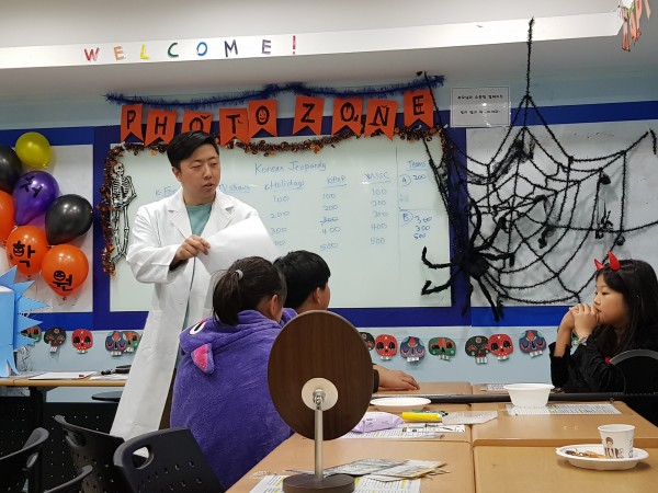 Korean Jeopardy Game for Halloween From left to right: John teacher, 김솔하, 김승연, 정아린 Top picture: 김승연- "Look! A spider! It must know the answer to the question..." Bottom picture: Who is that handsome doctor?