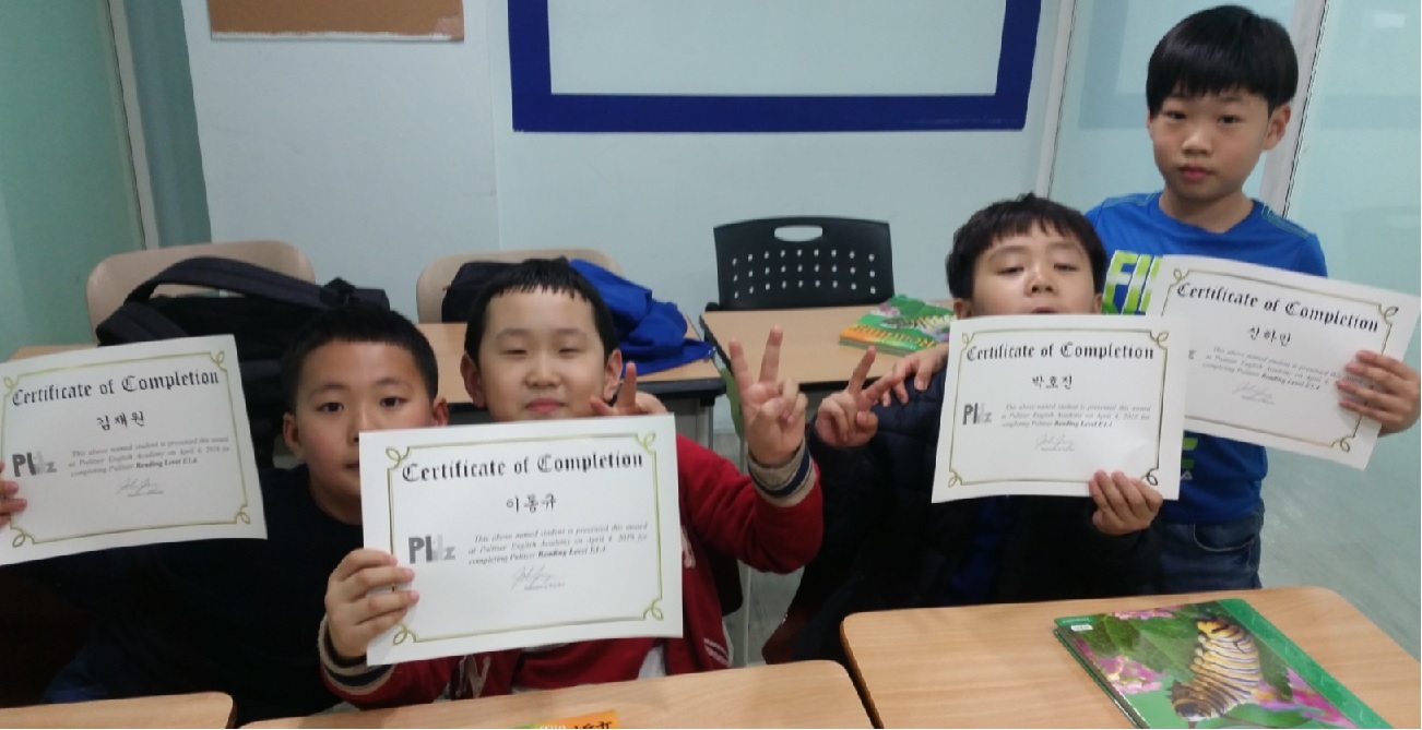 Reading level 1.4를 마친 신하민, 이동규, 김재원, 박호진 학생들