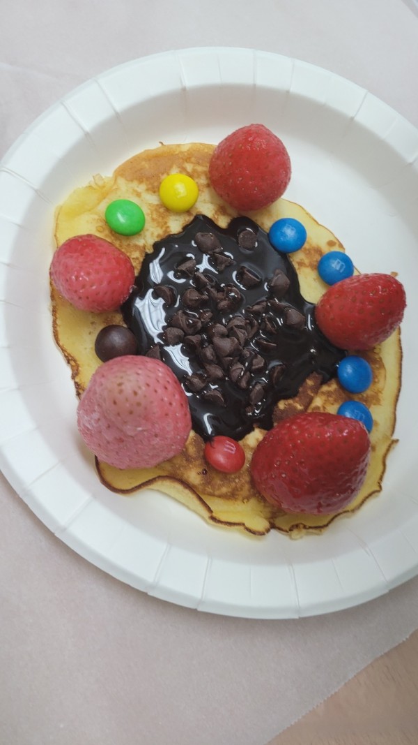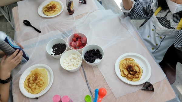 The next story project class was for "If you give a Pig a Pancake" and we learned all the ingredients needed and recipe to make a basic Pancake. However, I showed them that they could put more toppings than just Maple syrup. So we had blueberries, strawberries, chocolate chips, whip cream, sprinkles, and marshmallows. Of course Maple syrup but also chocolate syrup
