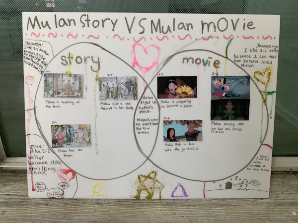 The students compared the story version of Mulan and the movie version of Mulan in a Venn diagram. They also chose the scene that they like better.