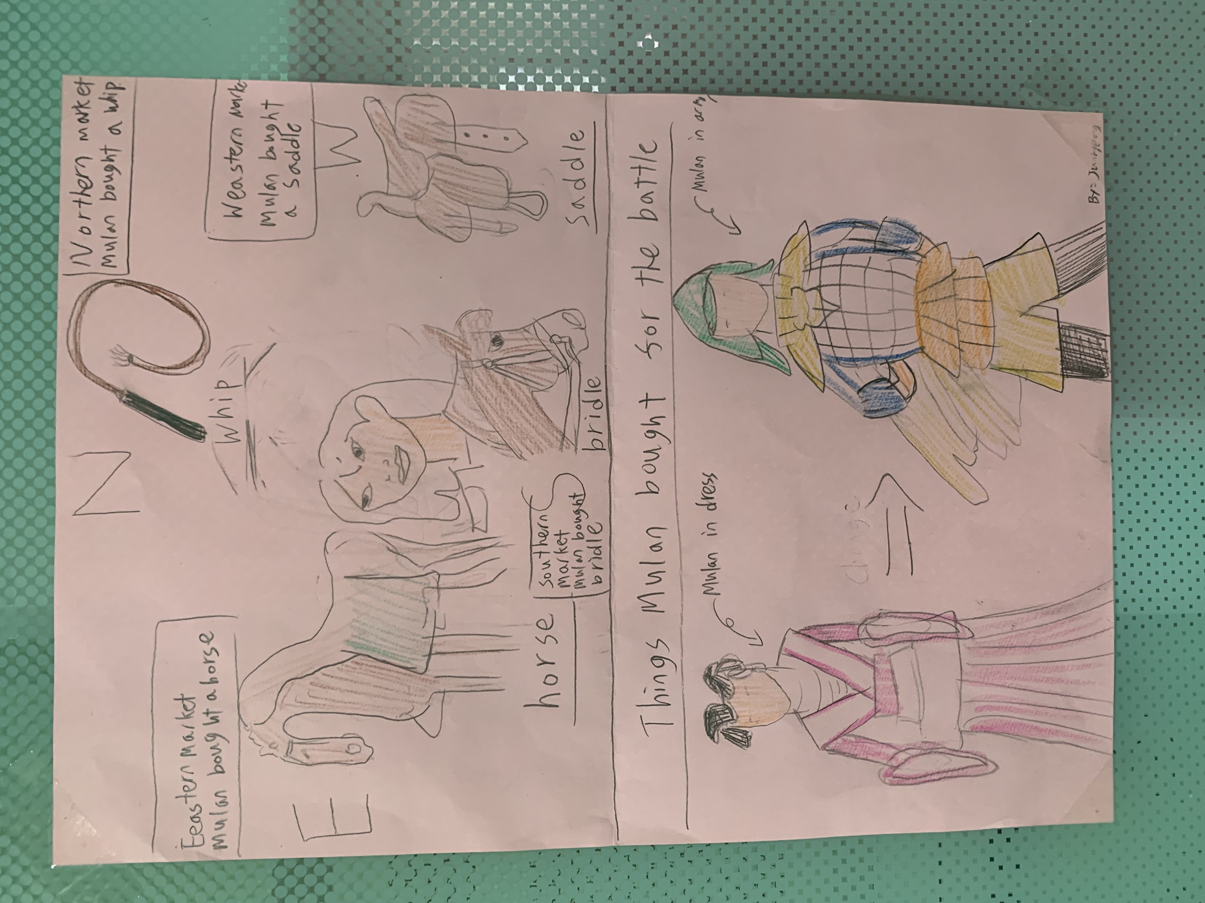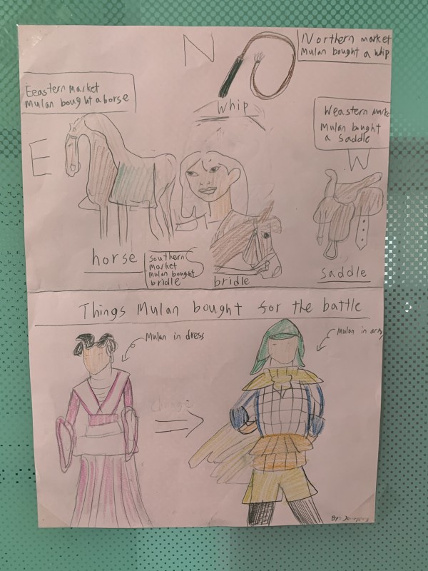 The students drew the things Mulan bought in eastern, western, southern, and northern markets and the the change in Mulan’s look from wearing a dress to wearing an armor.
